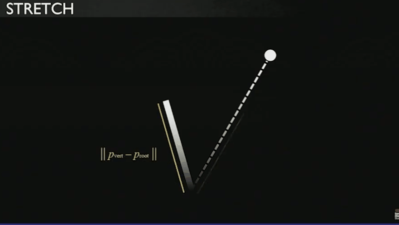 As I explained, we need to find the root position and calculate the length of every vert’s distance from the root.(Length) And we preserve this value and scale the post-offset distance between the vert and the root back to the preserved original length.
