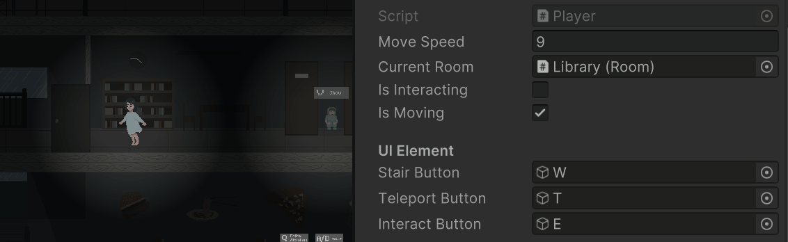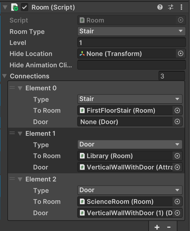 And in each connection, if it’s not leading to a stair, then there should be a door. By dragging in the correct door script, the two roomcheck colliders can update all characters’ current room. See gif below.
