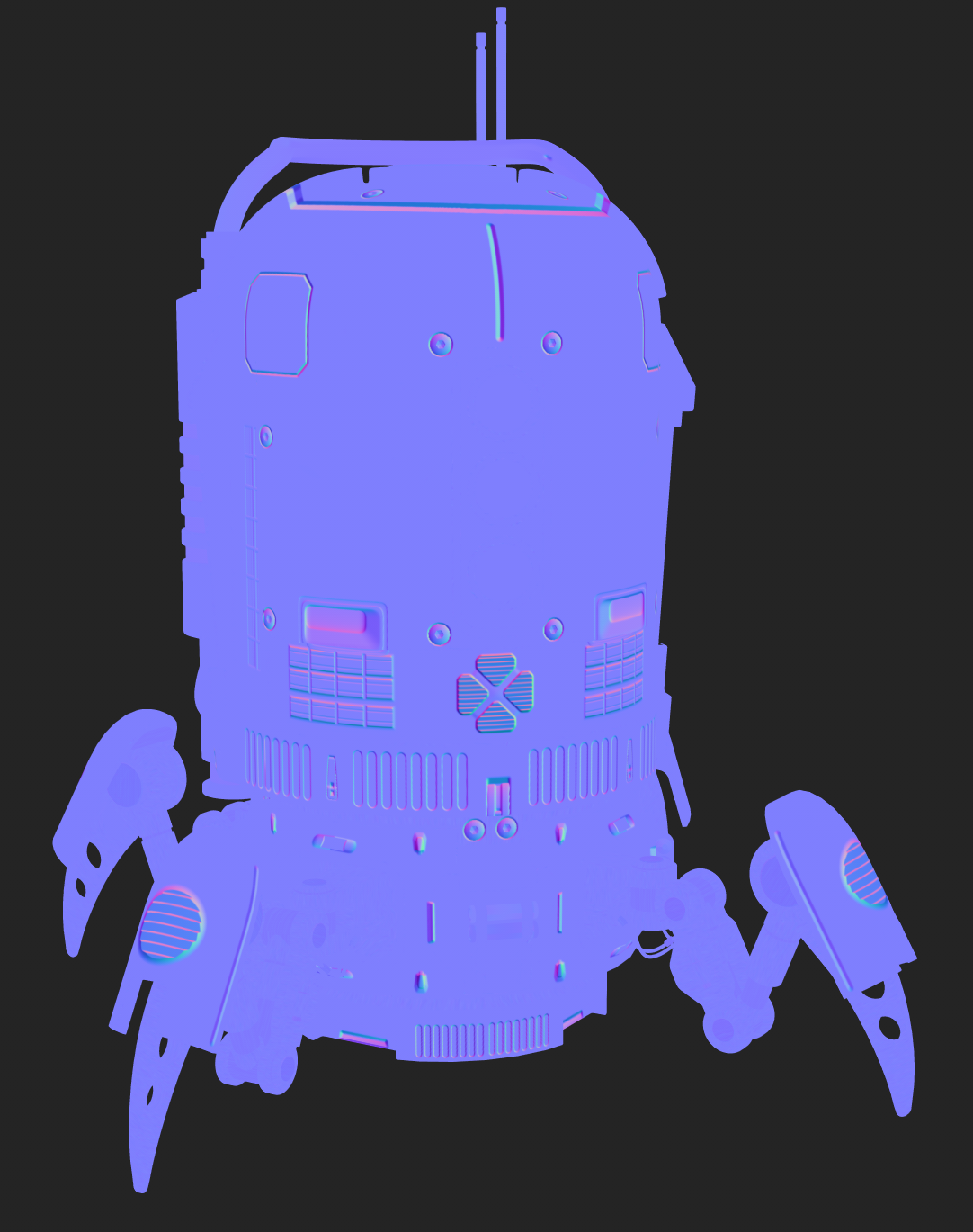 This map fakes tiny surface details by changing the light’s bouncing direction. Obviously it’s unrealistic to model every little bump on the mesh, thus normal map can solve this with just three channels(RGB)